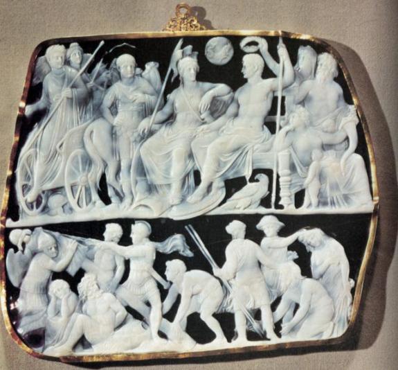 從網(wǎng)上字典中我們可以查到cameo的本義是:刻有浮雕的寶石或貝殼。 而更細致的解釋是: 石雕或貝雕:用去除材料法鏤刻的寶石或貝殼,尤其指那些圖案凸起且背景由多層對比色組成的雕塑 ( A gem or shell carved in relief, especially one in which the raised design and the background consist of layers of contrasting colors. ) 其實這里的CAMEO指的是一種歐洲特有雕刻工藝品,這種雕刻工藝在古羅馬時代即已出現(xiàn)。常采用的材料有縞瑪瑙(有非常細的平行紋帶的瑪瑙)和貝殼,這兩種材料都有平行的層理結(jié)構(gòu),通常彩色或暗色的紋帶是作為圖案的背景,而通過對白色的紋帶進行細致的鏤刻形成異常精美的圖案。 下面就是為古羅馬奧古斯都皇帝(屋大維)制作歌頌其武功的瑪瑙CAMEO工藝品。 再來欣賞下奧古斯都皇帝頭像的CAMEO工藝擺件(約公元10-42年)。 下面這張是近代用貝殼雕刻而成的CAMEO單面紀念章,圖案是英王喬治四世頭像。 由此我們可以看出,評級幣術(shù)語中的CAMEO,其實是指類似CAMEO工藝品的那種霜白色的噴砂效果,是對底板鏡面光澤描述PROOF的一種補充描述。 而ULTRA CAMEO 從字面上解釋就是超級CAMEO效果,個人認為與一般CAMEO效果的區(qū)別在于圖案的磨砂更細膩,與底板反差極其強烈,近乎于珍珠般的光澤。 由于這種工藝對中國人來說是非常陌生的,因此筆者目前尚未找到確切的翻譯,建議將其譯為“寶石光澤”。 [ 此帖被nickchen在2011-05-17 09:39重新編輯 ]