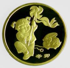 該普通紀(jì)念幣背面主景圖案為手舉風(fēng)車的小女孩和兔燈,內(nèi)緣下方刊“辛卯”字樣。