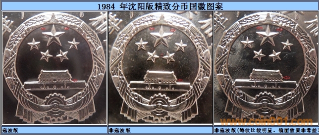 這里我舉一個簡單的列子,下面的圖片我選用了3張圖片(沈陽版1984年精致1分),通過圖片大家可以發(fā)現(xiàn)雖然3分精致分幣底板不同,但是壓印的效果幾乎沒有明顯的差異,考慮到沈陽版的精致套裝官方的發(fā)行數(shù)量: 5750套,通過一些細節(jié)的觀察我猜測1984年的精致分幣使用的是中晚期的工作模