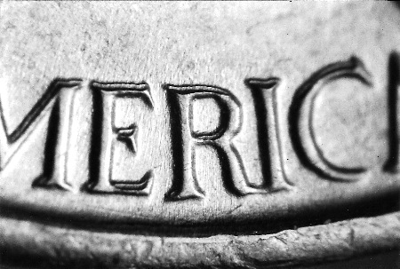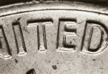 這幅照片里 AMERICA 一詞的字母上的重影是真正的重模現(xiàn)象。這是一枚 1950 精制5分硬幣。
