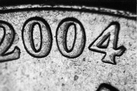 這幅照片顯示出2004-P 杰弗遜5分硬幣上的真正重模。