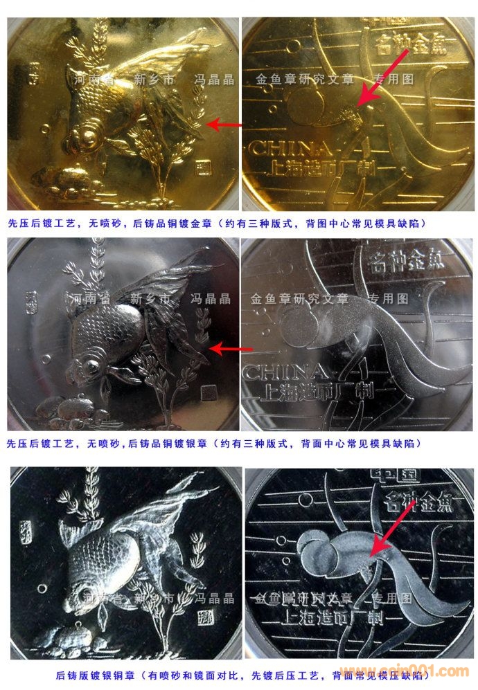 5.金魚鍍銀章,有的是有噴砂和鏡面對比的,但重量明顯比銀章要輕,銀章裸重約22.3克;“先鍍后壓”工藝,上幣開始使用的時間也較晚;