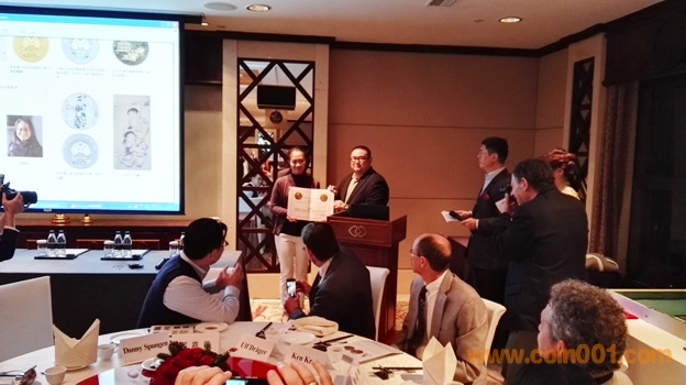 晚宴的主題是尼克布朗年度人物頒獎(jiǎng)儀式, 100余位國(guó)內(nèi)外的知名錢幣專家和錢幣公司一起參與其中,我和孫老師座一桌,同桌還有愛秀集團(tuán)總裁周麥可先生,美國(guó)貓王Peter ,擁有幣王奉天一兩的收藏家周大為,上幣設(shè)計(jì)師趙檣,南京造幣廠設(shè)計(jì)師張琛琛,上幣博物館前館長(zhǎng)張耀群等,其他桌的我基本都不認(rèn)識(shí)。頒獎(jiǎng)儀式的氣氛非常熱烈。尤其值得驕傲的是上海造幣廠雕刻師余敏先生獲得2015年度尼克布朗人物獎(jiǎng),南京造幣廠張琛琛女士和上海造幣廠董慧珍女士獲得了收藏貢獻(xiàn)獎(jiǎng),3位造幣廠專家的獲獎(jiǎng)表明中國(guó)錢幣的設(shè)計(jì)在不斷的進(jìn)步。晚宴中有多位海外資深藏家發(fā)言探討錢幣收藏的心得,頒獎(jiǎng)儀式全程由陳景林先生擔(dān)任翻譯,廣東電視臺(tái)的主持人擔(dān)任會(huì)議主持工作。