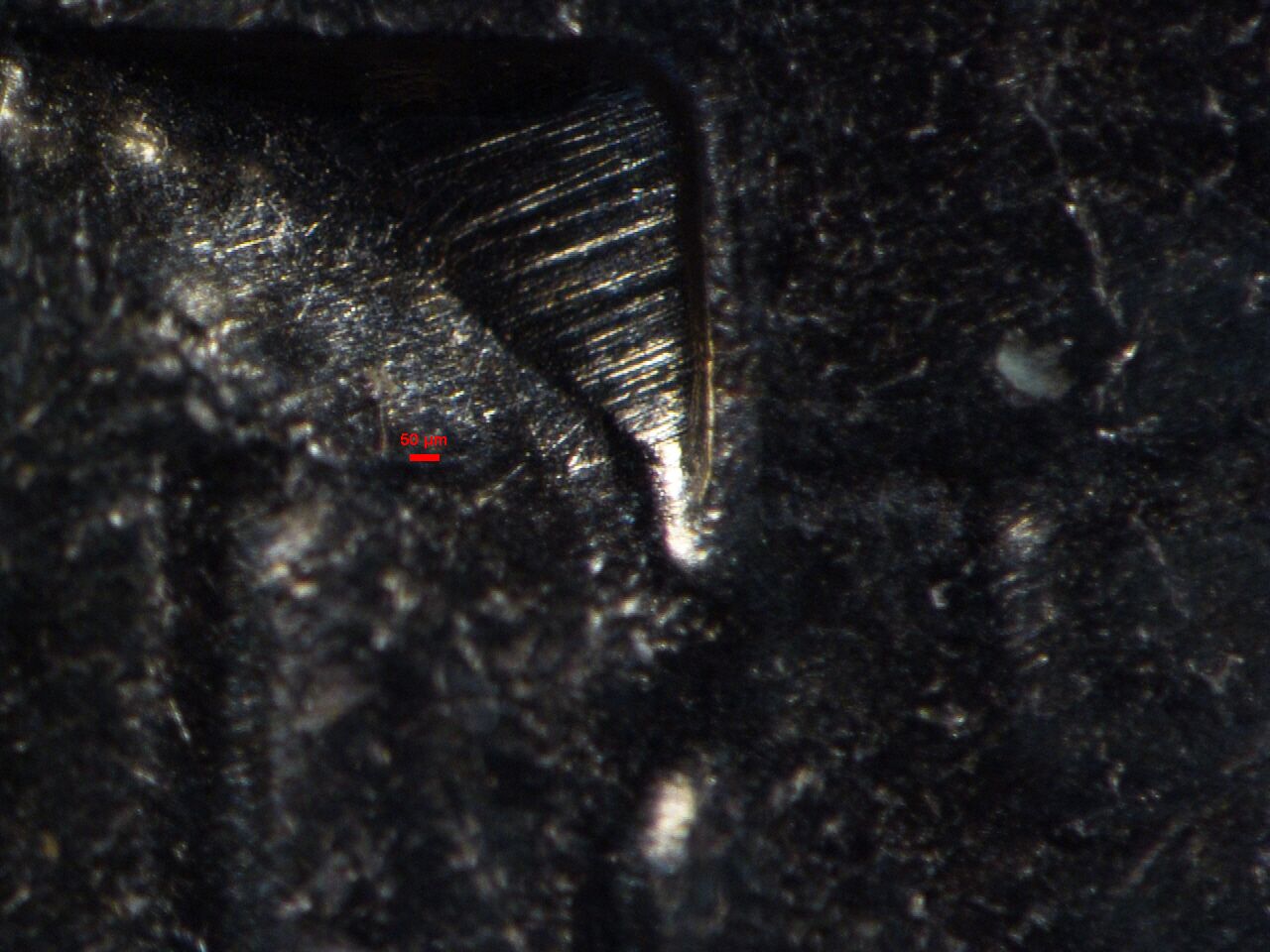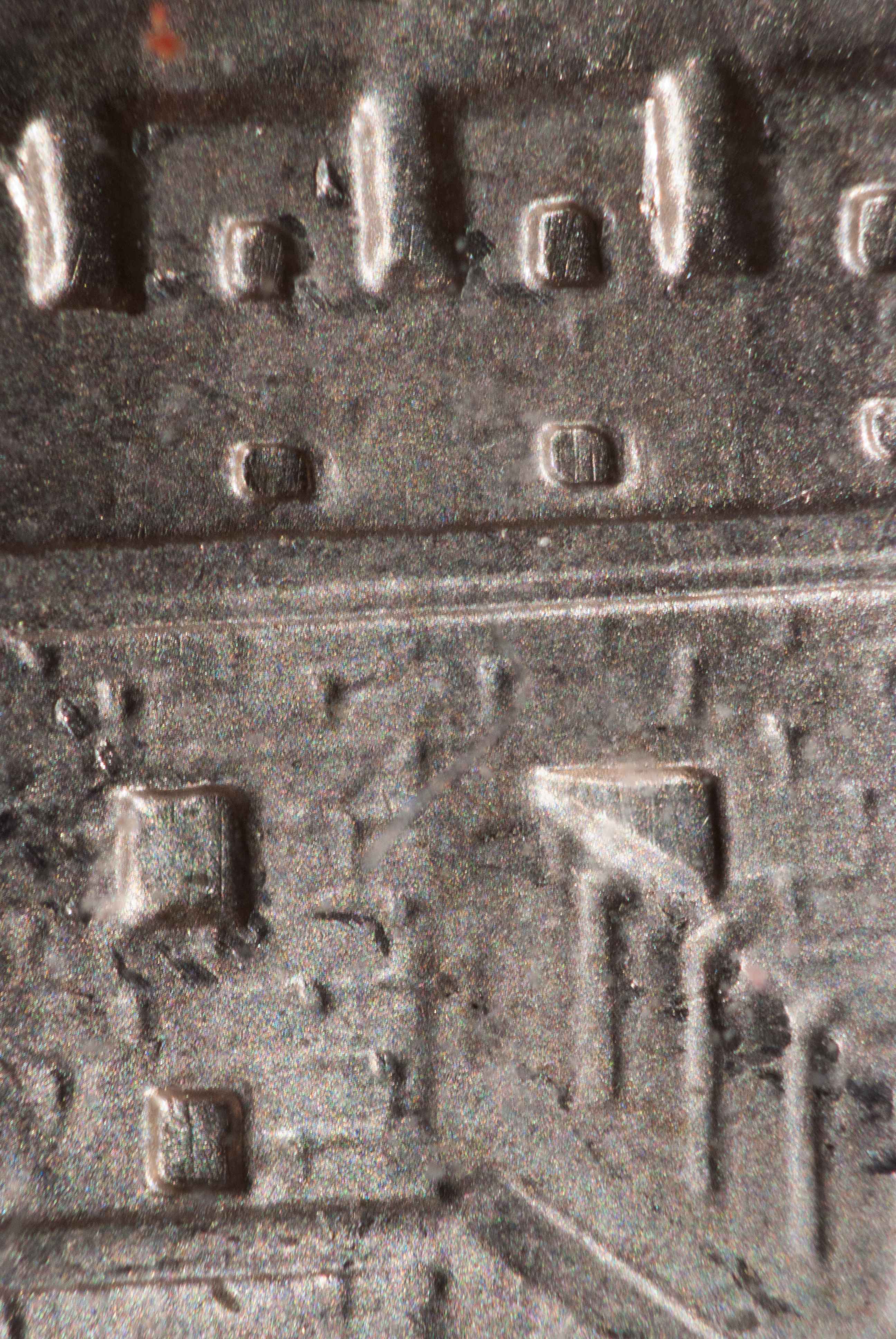 圖8:小黑本長(zhǎng)城幣正面第一個(gè)烽火臺(tái)三角形射孔放大圖,斜邊處有很寬的模具痕跡